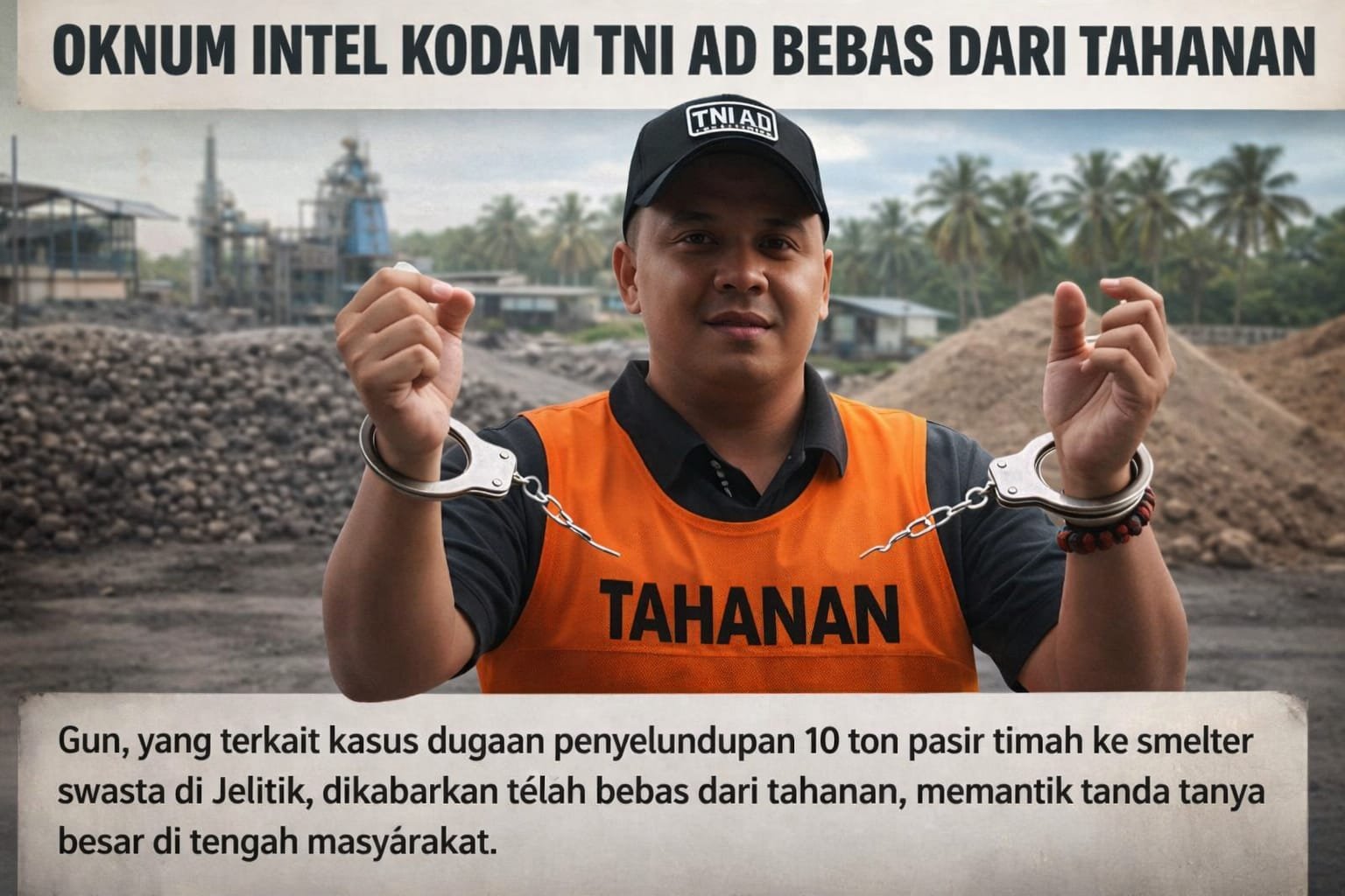 Joker – Merah.com  — Kabar mengejutkan kembali beredar di tengah publik Bangka Belitung. Seorang oknum intel Kodam TNI AD berinisial Gun, yang sebelumnya dikaitkan dengan kasus dugaan penyelundupan 10 ton pasir timah ke smelter swasta di kawasan Jelitik, dikabarkan telah bebas dari tahanan.