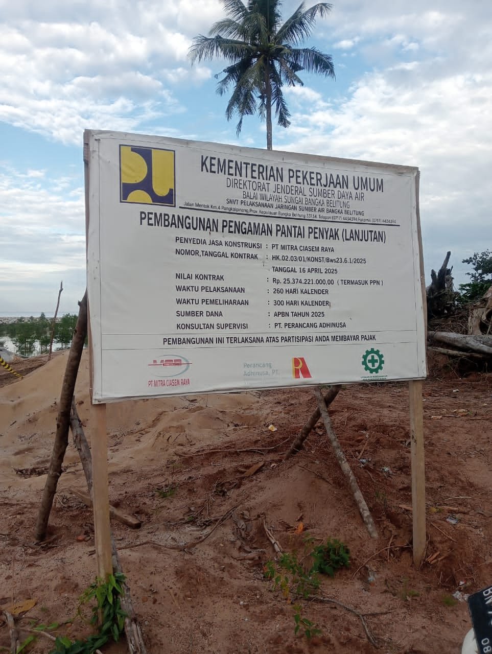 Joker-Merah.com – Bangka Tengah Proyek Pembangunan Pengaman Pantai Penyak (Lanjutan) yang dilaksanakan oleh Balai Wilayah Sungai (BWS) Bangka Belitung, Kementerian PUPR, kini menjadi sorotan publik. Nilai proyek yang mencapai Rp 25,3 miliar dengan pelaksana PT Mitra Ciasem Raya itu disebut-sebut memiliki sejumlah kejanggalan di lapangan, baik dari sisi volume pekerjaan, spesifikasi material, maupun transparansi teknis.