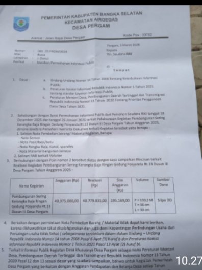 Pemerintah Desa Pergam kemudian memberikan jawaban tertulis tertanggal 5 Maret 2026. Dalam surat jawaban itu, pemerintah desa menjelaskan rincian realisasi kegiatan pembangunan siring kerangka baja ringan Gedung Posyandu RT 13 Dusun III Desa Pergam Tahun Anggaran 2025. Dalam tabel yang disampaikan, tercantum anggaran sebesar Rp40.975.000, realisasi sebesar Rp40.779.831, dan sisa anggaran sebesar Rp195.169. Volume pekerjaan dicantumkan dengan ukuran panjang 130,2 meter, tinggi 38 sentimeter, dan lebar 30 sentimeter, dengan sumber dana tertulis Silpa Dana Desa.